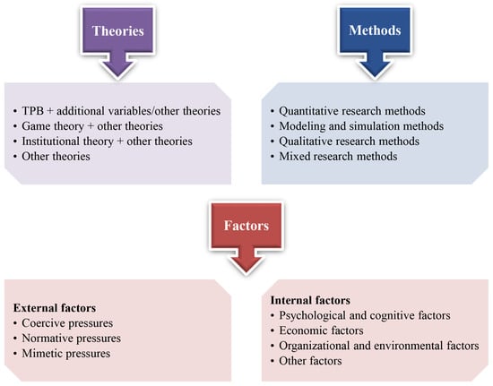 In terms of theoretical application, existing studies predominantly draw on the theory of planned behavior (TPB), game theory, institutional theory, and norm activation theory, often integrating multiple theoretical frameworks. Based on a comprehensive review, this study categorizes the application of relevant theories into four major groups:
