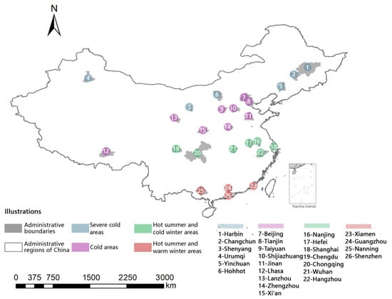This study investigates the relationship between urban building energy consumption indicators and urban form indicators using building energy consumption and urban form data from 26 cities in China as shown in Figure 1. The following are the exact definitions of severe cold areas, cold areas, hot-summer and cold-winter areas and hot-summer and warm-winter areas using Heating Degree Days (HDD) as a quantitative index (based on the Chinese national standard GB 50176-2017 and related studies). When HDD is greater than 3000 and less than or equal to 5000, this area belongs to the severe cold area. When HDD is greater than 2000 and less than or equal to 3000, this area belongs to the cold areas. When HDD is greater than 1000 and less than or equal to 2000, this area belongs to the hot-summer and cold-winter areas, but it still needs to be heated in winter. When HDD is less than or equal to 1000, this area belongs to the hot-summer and warm-winter areas. Data are collected using a set of statistical methods for calculating total residential building energy consumption and total public building energy consumption for each city through the statistical yearbooks of each city in terms of urban building energy consumption. In terms of urban morphology, this study constructed three types of urban morphology indicators (basic indicators, 2D indicators, and 3D indicators), obtained and collated 3D urban morphology data, AOI data, POI data, and Landsat remote sensing data of the study cities, and proposed a set of methods to calculate urban built-up area, total urban building area, urban residential building area, and urban public building area. The paper is organized as follows. Section 1 provides the literature review and research questions. Section 2 gives the methodology. Section 3 provides the data analyses and discussion, and the final section concludes the paper.