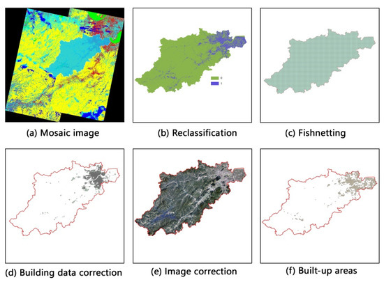 In this study, the built-up areas of the study cities were defined using the remote sensing technique. The satellite remote sensing data for each city were downloaded through the United States Geological Survey website, and the threshold of cloudiness was set at 10% for this study in the selection. The downloaded satellite remote sensing images needed to ensure that there were no clouds or only thin clouds in the study area. The application of Landsat remote sensing data in this study was in the separation of impervious surface. Firstly, it is necessary to collect remote sensing data of each view that can be assembled into a city, and then the remote sensing data of each view of a city will be supervised and classified separately. The supervised classified data are saved in Geotiff format and entered into GIS10.7 for processing, such as stitching, reclassification, and data statistics. In this study, the images were classified into impervious surface, green surface, water surface, and bare land. Finally, the images were classified into impervious surface (value 1) and non-impervious subsurface (value 0), as shown in Figure 2b. A 900 m × 900 m fishing network was established (Figure 2c), and the image element size of remote sensing data was 30 m × 30 m. The areas with impervious surface greater than 60% were counted in a table displaying zoning statistics. Landsat data with a resolution of 30 m has some limitations in supervised classification. For example, in the satellite remote sensing map in summer, some vegetation with higher height obscures a large area of the impervious surface, so there is an urban area classification error, and after supervised classification, the classification results need to be further corrected, and this study applies the high-definition satellite remote sensing data of LocaSpaceViewer, and the correction of the supervised classification results is performed by applying the urban building 3D data of LocaSpaceViewer, as shown in Figure 2d,e. The accuracy of the urban area can be greatly improved after the three-way cross-checking of Landsat data, building data, and high-definition data, as shown in Figure 2f. The supervision classification results and the results of urban built-up areas in the severe cold region, cold region, hot-summer and cold-winter region, and hot-summer and warm-winter region are shown in Figure 3 and Figure 4.