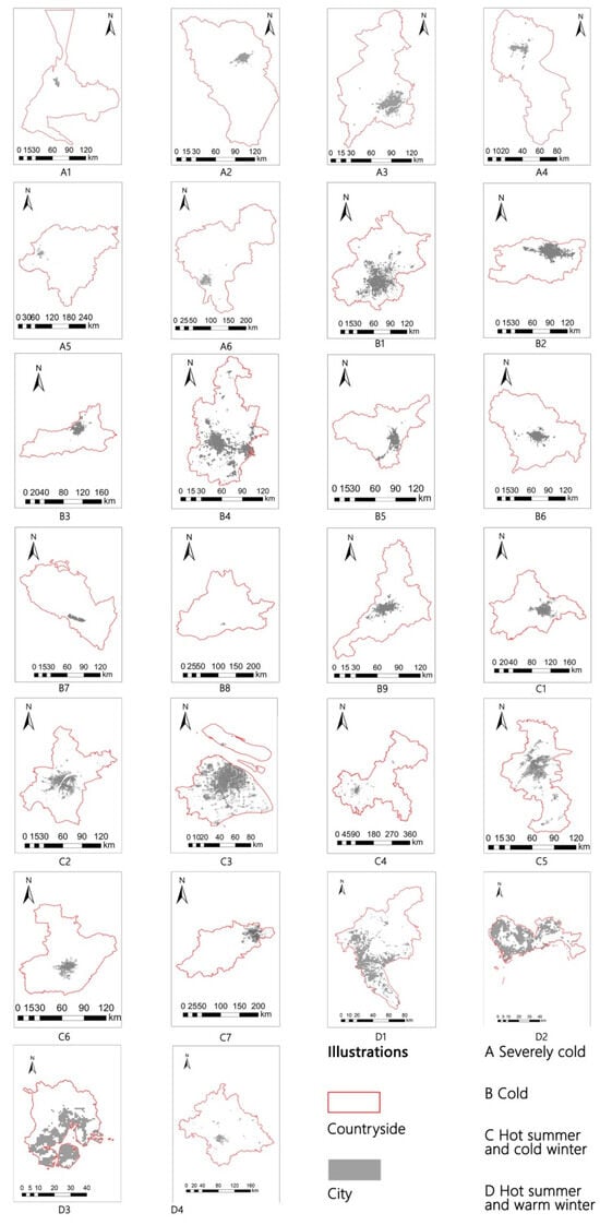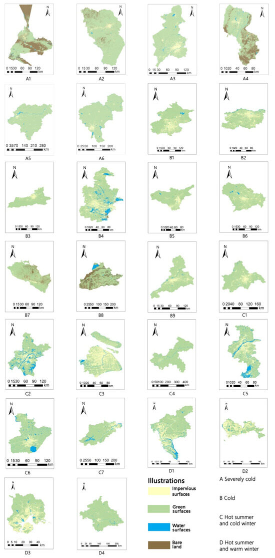 The results of urban built-up areas: (A1–A6) Urumqi, Hohhot, Shenyang, Yinchuan, Harbin, Changchun; (B1–B9) Beijing, Tianjin, Zhengzhou, Shijiazhuang, Taiyuan, Xi’an, Jinan, Lanzhou, Lhasa; (C1–C7) Chengdu, Wuhan, Shanghai, Chongqing, Nanjing, Hefei, Hangzhou; (D1–D4) Guangzhou, Shenzhen, Xiamen, Nanning.