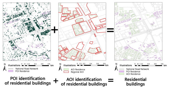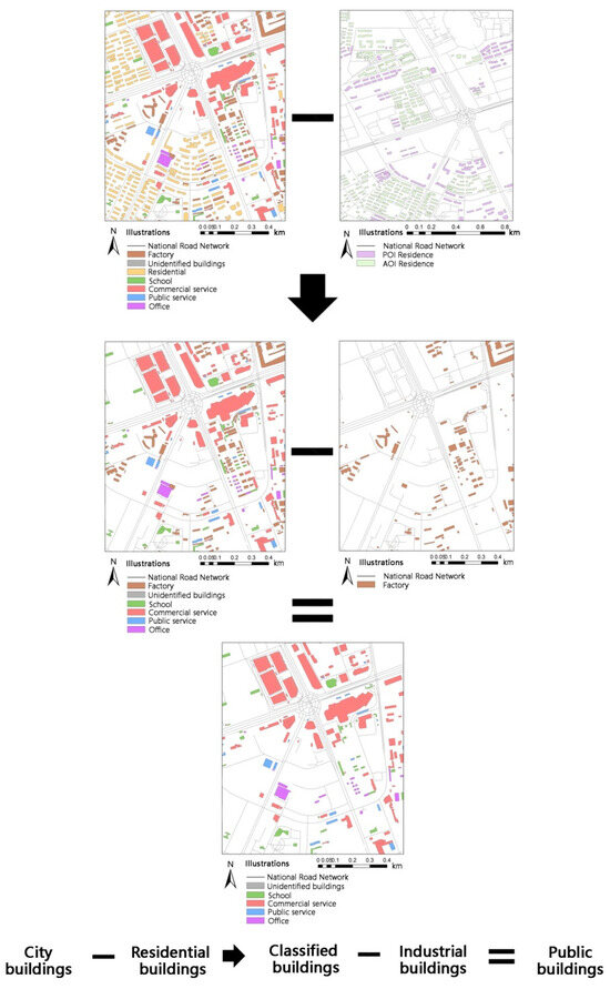 After distinguishing residential buildings from urban buildings, the remaining buildings in this study are divided into five categories: schools, office employment, public services, commercial services, and industrial buildings. This study mainly uses different types of POI data existing within and around a certain range of the building vector and spatially connects POI and building vector by ArcGIS10.7 and Excel2016 software using the principle of closest and a certain range and increases the functional type attribute with the highest weight value to the building vector by the weight coefficient method. However, all building functions at the urban scale cannot be fully identified by POI data alone, so this study continues to use AOI data to supplement the identification of the remaining unidentified buildings to achieve functional classification of urban buildings, as shown in Figure 5.
