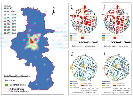 The building classification method of the empirical data is to check the buildings in the sample area with the usage status of the real buildings one by one and classify the building categories into one of the five categories: residential, school, commercial service, public service, and office employment. The detailed validation data and empirical data classification results are shown in Figure 5, and the validation statistics are shown in Table 2. It can be seen that the buildings are identified, and the accuracy of building data information is very high in both high-density and low-density building areas.