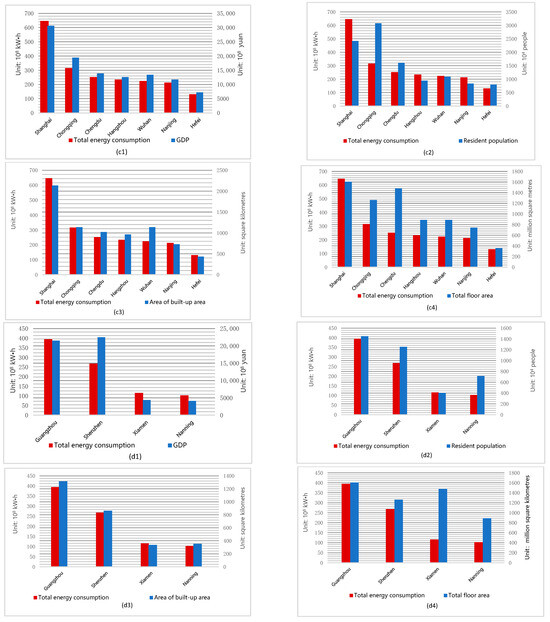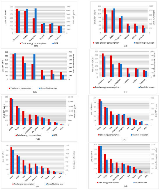 In cold regions, there is a general trend that the larger the GDP, the resident population, the built-up area, and the total building area, the greater the total energy consumption of urban buildings, as shown in Figure 7(b1–b4). Total building energy consumption is significantly correlated with total building area, resident population, GDP, and built-up area at the 0.01 level, as shown in Table 3. The correlation coefficient shows that the correlation between total building energy consumption and these factors is extremely strong.