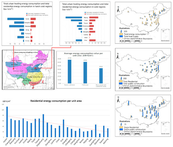 From the aspect of energy consumption per unit area, those in severe cold areas are higher than those in cold areas, and those in cold areas are higher than those in hot-summer and cold-winter areas. From the aspect of residential energy consumption per unit area, it can be seen that with the change of latitude, from low latitude to high latitude, the residential energy consumption per unit area shows a tendency to increase.