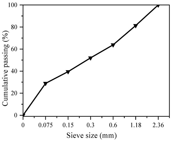 The original SGPs obtained from a sewage treatment plant in Zhengzhou is shown in Figure 1a. It was crushed and sieved through a 2.36 mm sieve. The crushed SGPs are shown in Figure 1b. In accordance with the specifications of China code GB/T 17431.2 [41], the basic physical properties and the sieve analytic curve of SGPs are presented in Table 3 and Figure 2. The distribution of particle size of SGPs was basically uniform.