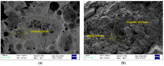 Figure 16 shows the morphology of foam concrete with different contents of SGPs, detected by SEM at different magnifications. The pore distribution of foam concrete CFC was relatively uniform, and most pores were small with regular shape. After adding SGPs in foam concrete, the pores were more connected. With the increase in SGPs content, the small pores with regular shape in foam concrete became irregular and large pores. This corresponds to the change in pore size distribution in Figure 13 and the change in pore roundness value in Figure 15. Moreover, the decrease in compressive strength of foam concrete with the increase in SGPs content, shown in Figure 9, primarily comes from the pore coalescence and interfacial weakening, while the increase in thermal conductivity with the increase in SGPs content, shown in Figure 11, is induced by the increased pore connectivity.