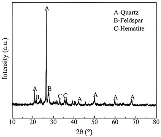 Figure 3 depicts the microstructure of SGPs detected using Zeiss Gemini Sigma 300 scanning electron microscopy (SEM) (Carl Zeiss AG, Germany), which shows that the interior of SGPs is highly porous and the pore size is mostly between approximately 20 and 200 μm. The high porosity explains its high absorption rate and low apparent density. The chemical components of SGPs were measured with the grounded powder referencing the specification for testing the constituents of cement specified in China code GB/T 12960 [39], and results are listed in Table 4. Figure 4 shows the XRD results of SGPs which include quartz, feldspar and hematite. The narrow and intense peaks of quartz indicate high crystallinity of SGPs, and the appearances of broaden peaks and humps revel the amorphous phases contained in SGPs.