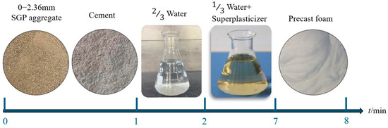 The foam concrete was designed with a dry density of 700 ± 50 kg/m3 at a grade A07 according to China code JGJ/T 341 [42]. The water to cement ratio was 0.35. With a similar expected dry density of foam concrete with/without SGPs, and referencing existing studies on foam concrete with lightweight aggregates or polyethylene powder at comparable dry density [21,26], the content of SGPs replacing cement varied for 10%, 20% and 30% total mass of cement-water mixtures (Table 6), while the corresponding specimens were denoted as SGFC_10, SGFC_20 and SGFC_30. Meanwhile, the basement of foam concrete produced with cement paste and foam was used as a reference, denoted as CFC. The superplasticizer was employed at 0.5% of cement dosage.