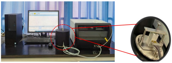 The thermal conductivity of foam concrete was tested using a Hot Disk Analyzer (Hot Disk AB, Gothenburg, Sweden) with the transient plane heat source method [45]. The 5501 F1 probe of the analyzer was placed between two cubic specimens with dimensions of 40 mm, as shown in Figure 7. The detection depth was set to 12.5 mm with a period of 160 s. The average of two test results was taken as the thermal conductivity.