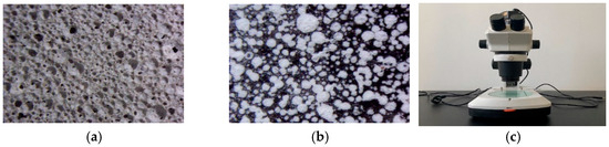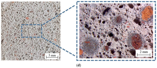 The internal structure of foam concrete was detected using porosity analysis, pores distribution test and scanning electron microscopy (SEM). The porosity analysis and pore distribution tests employed an XTL-BM-8TD stereomicroscope (Shanghai BM Optical Instruments Manufacturing Co., Ltd., Shanghai, China) and Image-Pro Plus image (IPP) analytic software 1.0. The foam concrete was cut and polished (Figure 8a), and the samples were dried and blackened. The pores of the samples were filled with nano-calcium carbonate powder, creating high-contrast black/white observation surface to make accurate image analysis (Figure 8b). The sample images were taken by XTL-BM-8TD stereomicroscope (Figure 8c) [46]. These images were processed and analyzed using IPP. The pore structure (Figure 8d) was investigated using SEM, as shown in Figure 8e, after curing for 28 days.