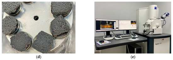 Pore structure detection and SEM analysis: (a) polished section; (b) pore-filled section; (c) XTL-BM-8TD stereomicroscope; (d) SEM samples; (e) SEM equipment.