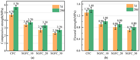 Effect of SGPs content on compressive and flexural strengths of foam concrete: (a) compressive strength; (b) flexural strength.