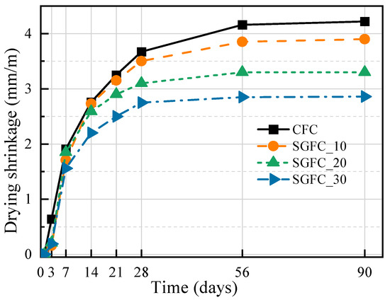 The effect of SGP content on the drying shrinkage of foam concrete is shown in Figure 10. The free water consumption and evaporation of foam concrete in the early stage of cement hydration caused a gradual increase in internal pressure in capillary pores, resulting in a sharp increase in shrinkage of foam concrete in the first 7 days [47]. With continuous hydration of cement and evaporation of free water, the relative humidity in the pores of foam concrete was close to the ambient humidity, and the drying shrinkage gradually slowed down. Therefore, drying shrinkage mostly occurred within the first 56 days, and minorly increased afterward.