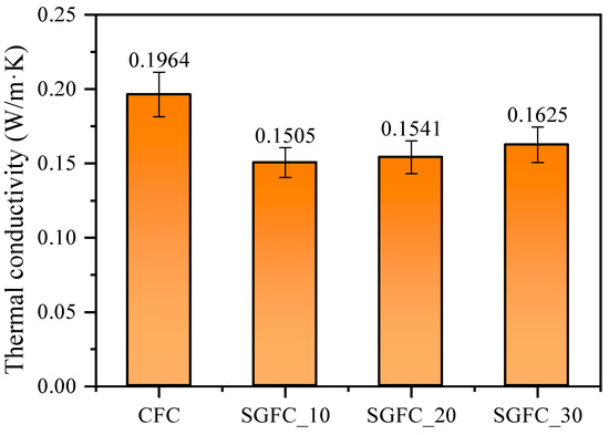 Figure 11 shows the influence of SGP content on the thermal conductivity of foam concrete. SGFC_10, SGFC_20, and SGFC_30 had a decrease in thermal conductivity by 23.4%, 21.5%, and 17.3% compared to referenced CFC. This reduction can be attributed to SGPs, which increased the internal pores of foam concrete to prolong the heat conduction path with more tortuous, hindering the efficiency of heat conduction of foam concrete [48]. However, although adding the SGPs could create a decrease in thermal conductivity of foam concrete, higher content of SGPs resulted in an increase tendency. When SGP content was 10%, the thermal conductivity of foam concrete was as low as 0.15 W/(m·K). When SGP content reached to 30%, the thermal conductivity of foam concrete increased to 0.16 W/(m·K). This indicates that a rational content of SGPs can improve the micro-structure of foam concrete with an even pore distribution, while a high content SGPs will increase the interface between SGPs particles and cement paste, leading to the pores merging and connecting with each other to increase the connection path of internal heat transfer, finally showing an increase in thermal conductivity [21].