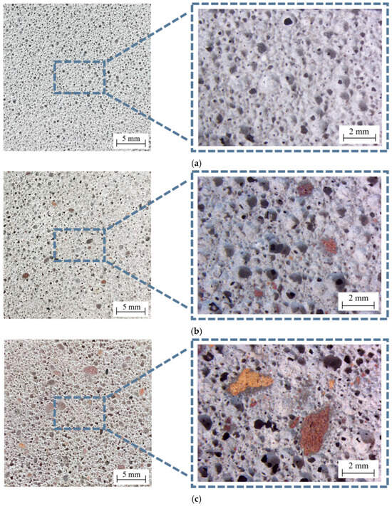 Current strategies to mitigate the disadvantages of foam concrete focus on optimizing water to cement ratio [13,14], adding mineral admixtures such as fly ash, silica fume and alkali slag [15,16,17], introducing functional aggregates [18,19,20], or admixing polyethylene powder [21]. Among them, aggregate modification in appropriate particle dosing presents particularly compelling advantages to maintain mechanical properties with reduced cement content and shrinkage [8,22,23]. However, critical tradeoffs are involved in its practical implementation, since excessive aggregates compromise mechanical integrity, and conventional sand additives face segregation issue caused by density mismatches [24]. This drives a growing interest in lightweight aggregates (LWAs) to solve this kind of technical problem. LWAs, including expanded perlite and glass sand [6], recycled waste and byproducts [7], expanded clay aggregate [25] and other kinds [26], benefit hygroscopic variants, causing a 20–40% reduction in shrinkage with internal curing. Solid waste derivatives such as recycled glass and fly ash microspheres lead to a 30% reduction in cement with a slight impact on mechanical performances [6,7,27]. Porous architectures (biochar) enhance thermal insulation via multiscale pore coupling [28]. However, the production of LWAs also faces more critical constraints, such as the geographical limitations of natural LWAs like pumice, the intensive energy consumption of artificial LWAs sintered over 800 °C, and the strength degradation over 50% for waste-derived aggregates with a weakened interfacial transition zone [29]. It is urgently required to find LWAs with a combination of environmental sustainability, low carbon production, and multi-functional performance enhancements.