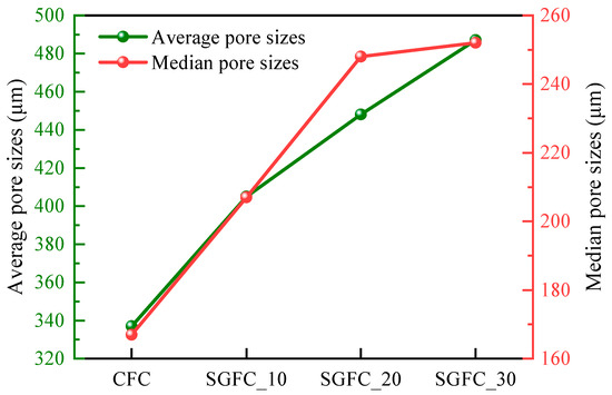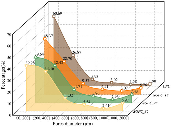 Figure 14 presents the statistical average and median pore sizes of foam concrete. The average pore size was 337 μm, 405 μm, 448 μm and 487 μm, while the median pore size D50 was 167 μm, 207 μm, 248 μm and 252 μm for the foam concrete with the SGP content of 0, 10%, 20% and 30%, respectively. This indicates that the incorporation of SGPs had a significant effect on the pore size of foam concrete. In referenced CFC, a considerable number of 60.69% of pores were observed with a pore diameter less than 200 μm. With an increase in SGPs content, the pores with a size less than 200 μm in foam concrete gradually decreased, while those pores larger than 200 μm gradually increased, resulting in foam concrete with pores increased in the average and median sizes. It is notable that the average and medium pore sizes of SGFC_10 are almost equivalent to that of referenced CFC, resulting in the interesting macro properties. This quantitative evidence further demonstrates that the change of pore distribution caused by the inclusion of SGPs can destabilize the foam pores in fresh mixture, leading to smaller foam pores to merge into larger ones. The effects of SGPs on the fine and uniform pore structure of foam concrete can be reflected on its macroscopic properties, as reported for the foam concrete with other aggregates [49,50]. Therefore, even SGPs may provide strength as a skeleton, the larger pore size reduces the strength of foam concrete [50]. This is correlated with the strength tests results reported in Figure 6.
