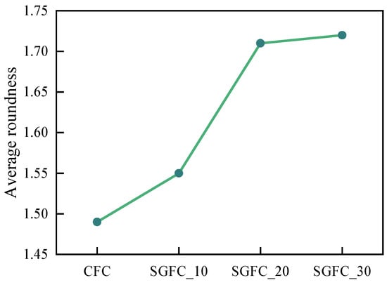 The shape of pores is also a factor affecting the performance of foam concrete, where irregular pores reduce strength and uniformity. The roundness value, defined as the ratio of maximum to minimum diameter of same pore, is typically used to quantify which the pore cross-section approaches a circle [21]. A larger roundness value means a pore with more irregular shape. The roundness of foam concrete is shown in Figure 15. The average roundness value of the CFC, SGFC_10, SGFC_20, and SGFC_30 was 1.49, 1.55, 1.71, and 1.72, respectively. This indicates that the pores of foam concrete became irregular with the increase in SGP content, which was more obvious in foam concrete with an SGP content over 10%. This is because SGPs cause the internal pores of the foam concrete to gradually develop from independent spherical pores with small volumes to interconnected and irregularly shaped larger pores. From CFC to SGFC_30, with a decrease in cement content and an increase in SGP content, the bubble maintenance ability in cement slurry gradually weakened, and the foam structure was insufficient to wrap aggregates during the forming process [24], resulting in a decrease in pore regularity and an increase in the average roundness.