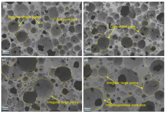 Morphology of the foam concrete: (a) regular shape pores; (b) connected pores; (c) irregular large pores; (d) inhomogeneous pore size.