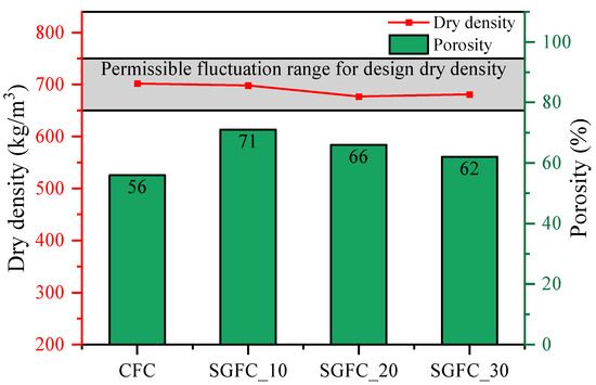 Figure 17 shows the porosity in relation to the dry density of foam concrete. Compared with referenced CFC, the addition of SGPs leads to increased porosity of foam concrete, leading to SGFC_10, SGFC_20, and SGFC_30 with an increased porosity of 26.8%, 17.9% and 10.7%, whereas the dry density of foam concrete presents a decrease with the increase in SGP content. This means that the dry density highly relates to SGP content, differing from that the density and porosity are inversely proportional to each other for foam concrete without SGPs [42,49]. Meanwhile, as seen in Figure 3, a certain number of pores contained in SGPs also increases the number of pores in foam concrete, thereby increasing the porosity. However, when SGP content increased to 20% and 30%, the pores in the unit area of foam concrete were less than those of SGPs, showing a decrease in porosity of foam concrete. Nevertheless, the addition of SGPs increases the porosity of foam concrete with a decrease in solid phase, and the thermal conductivity of foam concrete is much lower than that of cement matrix and other solid phases. This gives the foam concrete a significant advantage over conventional concrete in terms of its thermal insulation. However, it should be noted that when SGP content exceeds 20%, the phenomenon of foam merging and defoaming occurs during mixing, resulting in a decreasing trend in porosity. Therefore, a rational content of SGPs is needed to make foam concrete with better thermal insulation performance [51].