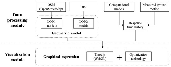 The data processing module is responsible for the preprocessing of urban building data and the computation of seismic responses. It takes various data sources, such as OpenStreetMap (OSM) for building footprints and OBJ files for detailed models and generates two distinct geometric models (LOD1 and LOD2) along with their corresponding seismic response time histories. The visualization module is a lightweight, JavaScript-based application that operates entirely within a standard web browser. It consumes the pre-processed data to construct and render an interactive 3D scene. By harnessing the power of WebGL via the Three.js library, this module achieves hardware-accelerated graphics rendering without requiring any specialized software installation by the end-user. Crucially, it integrates a suite of optimization techniques to ensure fluid, real-time performance even with large-scale urban models.