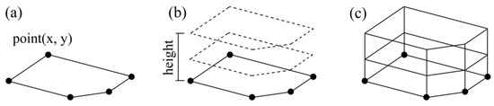 The geometric representation of an LOD1 building is procedurally generated within the visualization by extruding its 2D footprint to a specified height, as shown in Figure 3a–c. This real-time generation approach minimizes upfront data storage and transmission, requiring only a basic dataset comprising 2D footprints and building height or storey count.