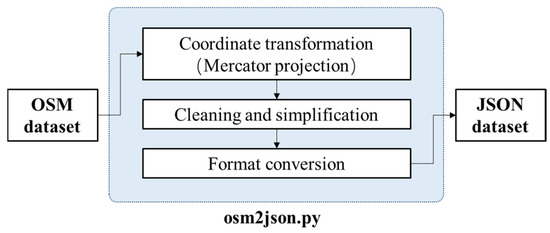 OSM defines three kinds of spatial data elements (node, way, and relation) and stores them in XML (Extensible Markup Language) format, and each element is referenced by an id. Node represents the basic geographic coordinates, i.e., a point. Way consists of a series of ordered nodes representing polylines or regions. Relation describes the relationship between any two elements. In addition, the attribute data, i.e., tag, is used to record additional information of elements, such as the name of a place. However, this structure, typically stored in an XML format, is not suitable for fast data reading and contains a lot of redundant information, resulting in massive waiting time during the data import phase. Therefore, the development of corresponding preprocessing programs, including streamlining and format conversion, is necessary for optimization. Figure 4 shows the flow chart of the preprocessor for OSM data, which was implemented via a custom Python 3.9.18 script that performs three key operations.