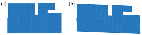 First, the building footprint polygons are extracted from the raw XML data, with coordinates converted into planar coordinate systems. The XML parsing was implemented with Python standard library, and the coordinate converting was implemented with GeoPandas. Specifically, OSM uses the World Geodetic System 1984 latitude and longitude system, which does not form a uniform grid. Plotting these directly on a local 2D plane leads to significant geometric distortion when visualizing large urban areas (as illustrated in Figure 5). To address this issue, the Mercator projection, an isometric cylindrical map projection, is commonly employed [21] in Web mapping services. Mercator projection produces an orthogonal (x, y) system, which preserves local angles and shapes, making it essential for accurately extruding 2D building footprints into 3D models. Equations (1) and (2) show the basic principle: