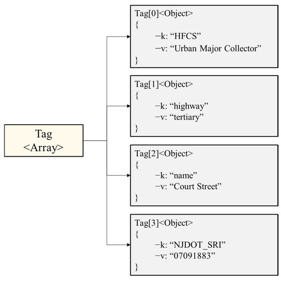 Second, data cleaning and simplification are performed. For urban area earthquake disaster scenarios, the original OSM dataset contains a large amount of redundant information, and the tags often contain key–value pairs that are not related to the entity attributes. Figure 6 shows the tag structure of a way element. “NJDOT_SRI” in Tag [3] is the identification information for the editor, for which it is difficult to distinguish the true meaning. Such information should be removed in the data simplification process.