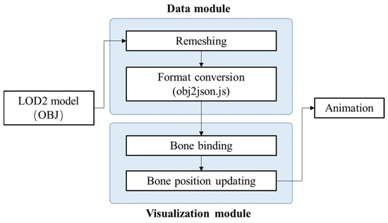 Figure 7 shows the workflow from preprocessing to visualization of the LOD2 model. The original OBJ model first undergoes a remeshing operation. As shown in the comparison in Figure 8, this step algorithmically reconstructs the model’s surface to create a dense and uniform distribution of vertices. A simple hierarchical skeleton is generated for floor levels (described in detail in Section 4). This method circumvents the need for complex floor plan generation and is suitable for general-purpose visualization schemes. The remeshing operation was performed using standard algorithms available in Blender 4.3 (or other 3D modeling software), via its Python scripting API.