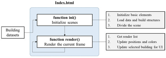 After preprocessing, the building data will be transmitted into the visualization module for the construction of the 3D scenarios and the expression of the earthquake disaster. The visualization module is driven by a JavaScript program that orchestrates the 3D scene using the Three.js library, which runs on web page accesses and renders the scene in real time. Its core logic is encapsulated within two primary functions, as illustrated in Figure 9.