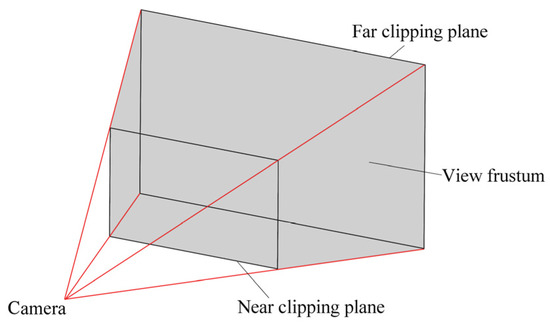 In the computer graphics rendering pipeline, a perspectival image is obtained by perspective projection from the frustum space of the camera. View frustum is a frustum of the pyramid of vision. It is the adaptation of the cone of vision that a camera or eye would have to a rectangular viewport typically used in computer graphics [29,30]. The planes that cut the cone perpendicular to the viewing direction are called the near plane and the far plane, which defines the extent of the rendered object. Objects outside the view frustum will not be rendered.
