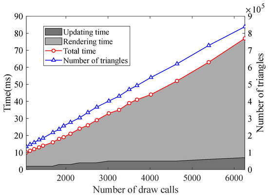 Draw call indicates that the CPU calls the graphics programming interface (such as DirectX or OpenGL) to command the GPU to perform the rendering operation. The number of draw calls considerably affects the graphics rendering performance [31]. In this program, each building model is rendered in a separate draw call. The number of triangles indicates the total number of triangle patches of polygon models in the scene, which can represent the rendering workload of the current frame. The time for updating and time for rendering represents the time taken by the update and render steps in the rendering of each frame, respectively. In addition, the time for obtaining the render list is basically less than 1 ms with the quad tree spatial index (see Section 4.3.2).