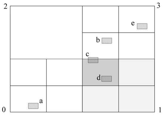 For the actual visualization process, it is necessary to pre-build a quad tree and embed the buildings into leaf nodes in the initialization stage. The squares in Figure 14 represent the buildings at this point, e.g., building c being embedded into leaf node [1,2]. In each frame rendering, the spatial extent of level 0 node (root node) and the view frustum are determined first. If some or all of them overlap, the four children (nodes of the next level) are recursively checked. If not coincident, the recursion of this branch is stopped. Eventually, a list of buildings contained by the view frustum in the current frame is obtained, which will be processed or rendered in the later steps.