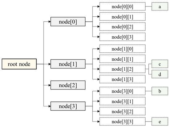 To overcome this limitation, we employ a quad tree spatial index, a highly efficient data structure for partitioning two-dimensional space [33]. The quad tree spatial index is often used in the analysis and classification of two-dimensional spatial data such as collision detection. The quad tree divides the space of the known range into four equal subspaces and performs the same recursive division to the next level, until a certain level or requirement is reached. The quad tree spatial index for an urban scene and the corresponding data structure are shown below.