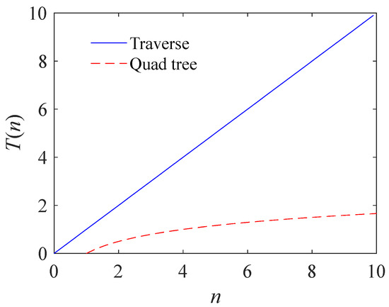 The quad tree-based scene division technique can reduce time complexity of searching from to . A comparison of the two algorithms is shown in Figure 16. The horizontal axis represents the scale of the input, and the vertical axis represents the time complexity , which is the maximum running time of the algorithm.