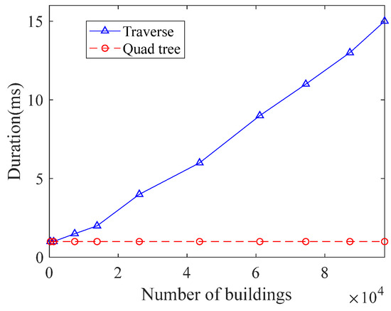 In the scenario with nearly 100,000 buildings used in this paper (see Section 5), a 7-level quad tree spatial index is constructed based on the size of site. The time required to perform the obtaining render list operation in different circumstances is shown in Figure 17. Notably, the time spent traversing each building is positively related to the number of buildings, which reaches 15 ms when the number of buildings is 97,367. The quad tree spatial indexing method always requires a computation time of less than one millisecond. Moreover, the delay in searching for the rendered object is substantially eliminated in this method, further improving the computing efficiency.