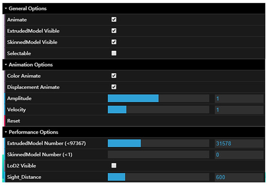 Therefore, dat.GUI [34], a lightweight graphical user interface library, was employed to provide direct, real-time control over the visualization, addressing the shortcomings of static methods. As shown in Figure 18, the interface provides several key interactive functions that empower users like emergency planners and engineers. (1) Dynamic Exploration and Filtering: The General Options allow users to toggle the visibility of different model types or switch between static and animated views. This allows them to filter the visual information and focus on either the overall urban fabric or specific high-fidelity structures. (2) Detailed Inspection: The Selectable function enables users to click on any building to retrieve and display its specific response data, potentially in combination with other HyperText Markup Language (HTML) or JavaScript elements. This transforms the visualization from a broad overview into a precise inspection tool, allowing for deep dives into the performance of individual assets. (3) Parameter Control: The Animation Options allow for real-time adjustment of the animation’s amplitude and speed. This enables users to exaggerate motion to better identify patterns of structural behavior or slow down the simulation to observe critical moments of the seismic response. (4) Performance Management: Crucially, the Performance Options allow dynamical adjustment of the rendering load by modifying the number of visible buildings or the graphics LOD threshold. By implementing these controls, the framework provides a basis for further development of user-centric features tailored for disaster assessment and planning.