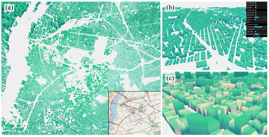 To verify the proposed framework’s practical effectiveness for regional buildings, a case study was conducted on a dense urban area of New York City. The dataset, derived primarily from OSM, encompasses 97,367 individual building models within a 9025 m × 7392 m region. This large-scale, complex environment serves as a robust testbed to evaluate the performance of our proposed visualization strategies under real-world conditions.