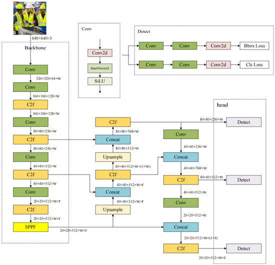 In construction sites, factory operations, and other industrial scenarios, the wearing of safety helmets is closely related to the life safety of workers. Traditional image detection methods typically rely on manually engineered features for object recognition [1]. For example, Park et al. [2] employed Histogram of Oriented Gradient (HOG) features combined with Support Vector Machine (SVM) classifiers for helmet detection. However, these methods require the extraction of a large number of feature samples to achieve effective recognition, resulting in substantial time and labor costs, and often suffer from poor robustness, limiting their applicability in practical environments. To improve supervision efficiency, helmet detection techniques based on computer vision have been widely adopted [3]. Current mainstream object detection algorithms can be broadly classified into two categories. The first is two-stage algorithms, which include methods such as R-CNN [4] and Faster R-CNN [5]. For instance, Fang et al. [6] applied Faster R-CNN to detect helmets in scenes with far-field targets and complex construction backgrounds, achieving excellent detection results on their collected dataset. The second category is single-stage algorithms, such as SSD [7] and the YOLO series [8,9,10]. The core idea of this type of algorithm is to input an image into the model and directly predict the target’s location and class from the raw image. Although the above detection models improve detection accuracy, they are often accompanied by high computational complexity and a large number of parameters. These issues result in significant hardware resource requirements, thereby limiting their deployment and application on resource-constrained devices. To address these challenges, many researchers have proposed improvements to network architectures.