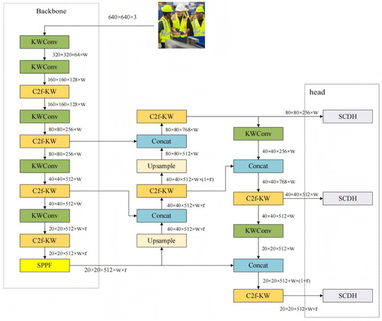 To address the issues of excessive parameter count and high computational complexity in helmet detection algorithms, which impose stringent requirements on deployment hardware, this study proposes a series of model optimizations based on YOLOv8. The architecture of YOLOv8 is optimized in this study, with a focus on the convolutional layers (Conv), the C2f module, and the head layer. The standard convolutional layers (Conv) and the C2f module in the backbone of YOLOv8 are replaced with KWConv and the newly proposed C2f-KW module, respectively. At the head of the model, a lightweight detection head named SCDH is designed based on the concept of shared convolution to replace the original Detect head. Additionally, the normalization layer within the convolution blocks is replaced with group normalization (GN), which better suits lightweight architectures and helps maintain detection accuracy. Finally, to enhance the model’s capability in image processing, the Wise-IoU loss function—featuring an intelligent gradient gain allocation strategy—is introduced to improve bounding box regression, significantly enhancing localization accuracy and detection performance in occluded and densely populated scenes. These enhancements effectively reduce the model’s parameter count and computational load, while improving inference accuracy and ensuring efficient performance across devices with varying computational capabilities. The structure of the improved model is shown in Figure 2.