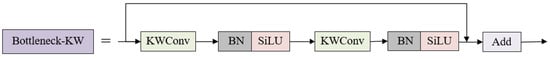 The original YOLOv8 model contains a substantial number of C2f modules, which leads to increased parameter counts and limited feature learning capacity. In helmet detection tasks, targets are often occluded and frequently consist of small objects. Under such conditions, the original C2f module lacks sufficient capacity for effective feature extraction and multi-scale information fusion, which negatively impacts detection performance across diverse environments. Moreover, in complex environments, targets may be affected by lighting variations, occlusions, or background interference, leading to unclear texture details, blurred edges, and significant information loss, thereby weakening the model’s feature representation capability. To address the aforementioned issues, the Bottleneck module in YOLOv8n is optimized by replacing the standard convolution with KWConv based on the concept introduced in KernelWarehouse (KW). As illustrated in Figure 4, KWConv dynamically adjusts the kernel sizes across different channels to enhance the adaptability of the receptive field. Subsequently, the SiLU (Sigmoid Linear Unit) activation function is applied to introduce non-linearity and strengthen the model’s feature representation capability. Finally, the Bottleneck-KW module is built based on this structure and used to replace the original Bottleneck module in the C2f block, forming the improved C2f-KW module. This enhancement effectively strengthens feature extraction while reducing computational cost. The structure of the improved C2f-KW module is shown in Figure 5.