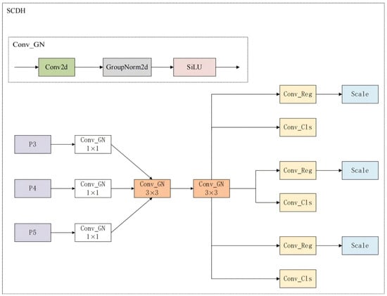 The detection head receives feature inputs from the P3, P4, and P5 levels of the feature pyramid. It first employs a 1 × 1 shared convolution to facilitate channel-wise information interaction and extract features at different scales. Subsequently, two 3 × 3 shared convolutions are applied for feature aggregation, reducing redundant information and enhancing the learning and extraction of distinct features. Finally, the Scale layer performs feature scaling to further enhance adaptability across multiple scales, enabling the detection head to effectively process inputs with varying resolutions. For normalization, SCDH replaces traditional Batch Normalization (BN) [20] with the Conv_GN module, which adopts the more suitable Group Normalization (GN).