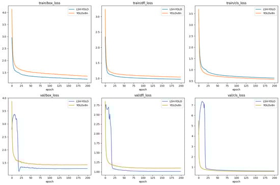 As shown in Figure 7, the loss curves of YOLOv8n and LSH-YOLO are compared. LSH-YOLO exhibits a faster decline and better convergence across all three loss components during training, indicating a stronger fitting capability. On the validation set, the loss values of LSH-YOLO stabilize after the 20th epoch without significant fluctuations or continuous increases, suggesting the absence of overfitting. Moreover, its overall validation loss remains consistently lower than that of YOLOv8n, reflecting superior generalization ability. Notably, LSH-YOLO consistently achieves lower errors in box_loss and dfl_loss, indicating improved accuracy in bounding box localization. In addition, the cls_loss of LSH-YOLO exhibits slight fluctuations during early training but converges rapidly in later stages, ultimately outperforming YOLOv8n. This suggests that its classification performance is more stable and reliable under complex conditions. Overall, LSH-YOLO outperforms YOLOv8n in terms of training stability and validation performance. This demonstrates that the lightweight improvements do not compromise accuracy, highlighting the model’s strong potential for practical deployment.