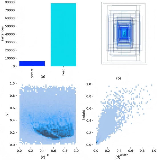 Visualization of the annotated training data. (a) Number and categories of helmet-wearing and non-helmet instances; (b) overall bounding box distribution; (c) distribution of bounding box center coordinates; (d) height-to-width ratio distribution of targets.