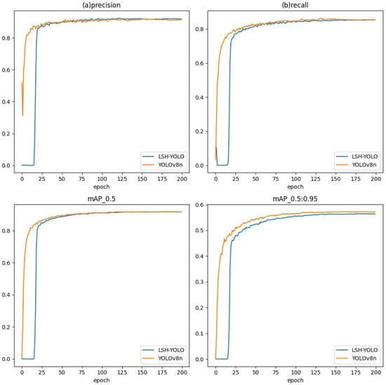 According to the training curves shown in Figure 10, the improved LSH-YOLO model demonstrates a faster convergence rate and a smoother upward trend in precision, recall, and mAP, with an overall trajectory that ascends more rapidly and steadily. This suggests that the model is able to quickly extract effective features during the early training stages and maintain more stable gradient updates throughout subsequent training, resulting in a more robust performance improvement process. This demonstrates that the proposed shared convolutional structure effectively reduces redundant computation and enhances the consistent representation of multi-scale features. Meanwhile, the incorporation of the Wise-IoU loss function alleviates the adverse impact of extreme samples during training, thereby further improving the model’s robustness and convergence.
