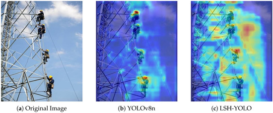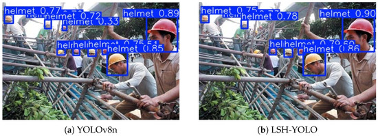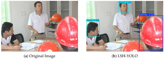 Compared with (a) in Figure 13, under dense small-target scenarios with visual interference, the LSH-YOLO model successfully detects a red helmet missed by the original model. This demonstrates that the improved model not only excels in detecting dense targets but also significantly reduces missed detections caused by occlusion.