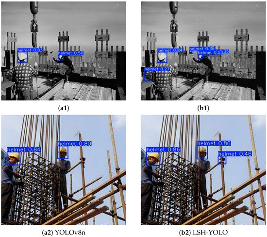 To demonstrate the effectiveness of the improved LSH-YOLO model, three types of representative images from the test set were selected for detection. These include scenarios of no helmet being worn, dense occlusion, and false detection.