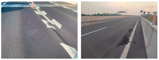 Interlayer bonding performance critically influences the service life of asphalt pavements. Poor bonding conditions readily induce fatigue cracking, interlayer displacement, rutting, and other distress [1,2,3]. As illustrated in Figure 1, deficient interlayer bonding at curved sections has caused severe pavement slippage under vehicular lateral forces. Effective interlayer bonding distributes surface loads throughout the pavement structure, whereas weak bonding confines stresses to upper layers, accelerating deterioration [4,5].