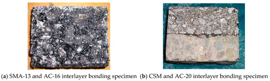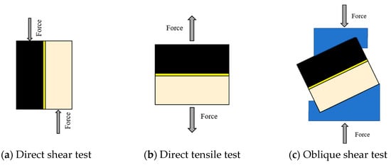 Extensive studies [6,7,8] have investigated interlayer bonding in asphalt pavements, focusing on two primary aspects: evaluation methodologies and influencing factors. Standard test methods include direct shear, tensile, and oblique shear tests (as shown in Figure 2), with direct and oblique shear being most widely adopted. Raab [9] employed model materials (steel balls simulating ideal aggregates in 10/20 permeable asphalt) to demonstrate gradation’s impact on interlayer shear strength via direct shear testing. Raposeiras [10,11] analyzed effects of mixture surface macrotexture, tack coat application rate, and loading rate using similar methods. Isailovic [12] revealed through monotonic and cyclic shear tests that monotonic results provide limited long-term performance insight, whereas cyclic testing accurately characterizes interface fatigue failure. The testing methods for interlayer bonding strength are relatively complete, and there are also many related studies. Due to the fact that interlayer bonding materials are generally asphalt-based materials, their performance is affected by factors such as temperature, loading speed, and material types. Liu [13] identified the temperature and humidity sensitivity of water-based epoxy resin adhesives (recommended for use in rigid bridge decks and high-temperature environments). Ai [14,15,16] analyzed the interlayer roughness performance using 3D laser scanning and quantified its correlation with interlayer bonding strength. Wang [5,17] developed a shear fatigue model and life prediction equation for the bonding layer. Overall, these studies indicate that the bond strength is influenced by aggregate properties, surface texture, characteristics of the bonding layer (material type, application rate), and service conditions (loading rate, temperature, humidity, confining pressure). While this research provides fundamental insights into evaluation protocols and material behavior, the investigations are primarily directed toward the interlayer bonding strength of pavement layers or studies of bonding materials. It remains unclear how the application of tack coat materials affects pavement structures, nor is it established what magnitude of interlayer bonding strength ensures complete interfacial bonding.
