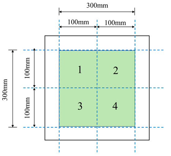 The interlayer shear specimen production process closely simulated actual pavement construction. A 30 cm × 30 cm × 5 cm lower slab was fabricated, followed by uniform application of a tack coat (1.0 kg/m2 design rate) to its surface. The upper layer was immediately compacted onto the tack-coated surface to form a composite slab, from which 10 cm × 10 cm × 10 cm shear specimens (5 cm per layer) were sectioned using a masonry saw (Figure 3). Representative specimens are shown in Figure 4. Three tack coat conditions were evaluated: untreated (no tack coat), emulsified asphalt, and SBS-modified asphalt.